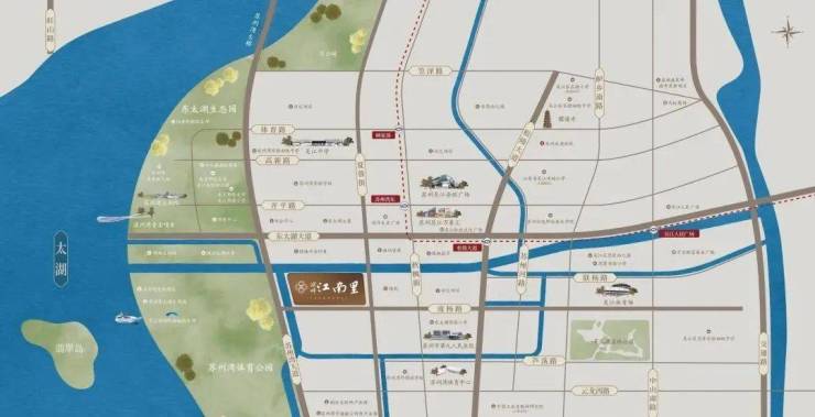 西侧毗邻东太湖百里风光带,尽揽万顷太湖盛景与湾区繁华,约1200亩东太湖生态园环绕,尽享纯天然生态氧吧。