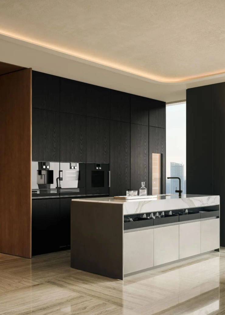而西厨区特别集结意大利奢华品牌高柜与中岛,以及德国顶奢厨电品牌GAGGENAU嘉格纳,黑金属质感与米咖相搭,利落干练。