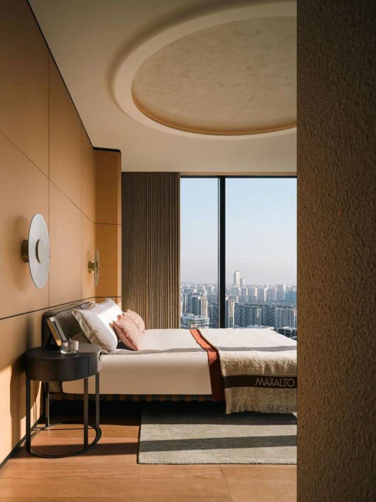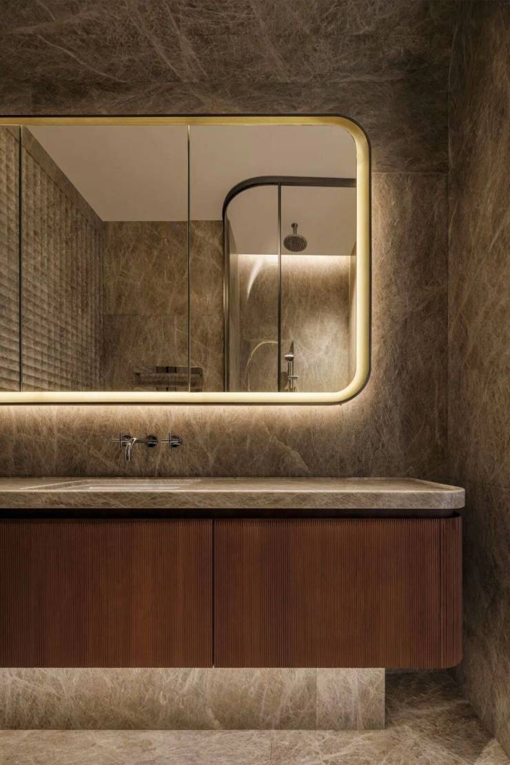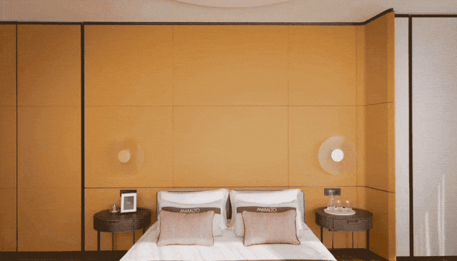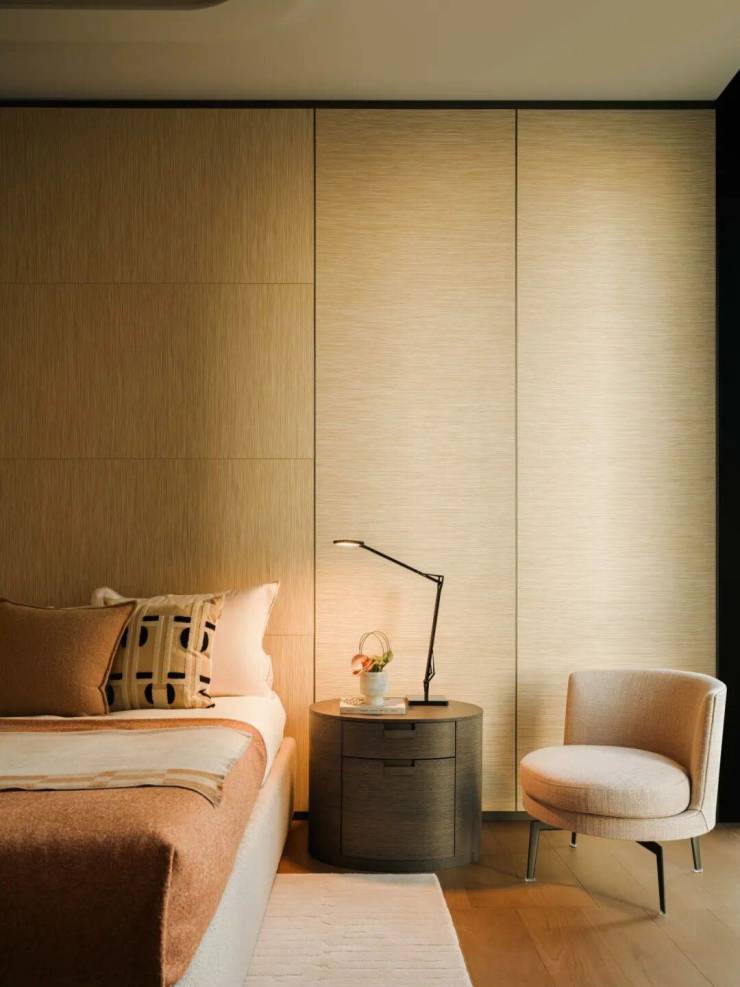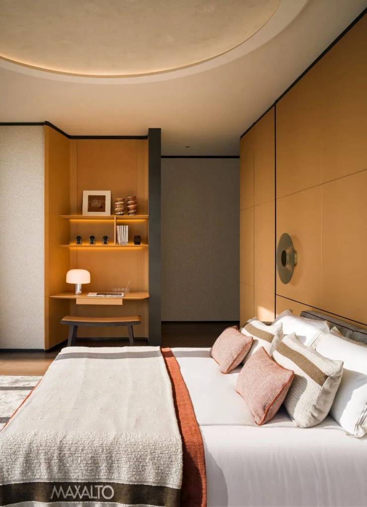 主卧以舒适至上为理念,并延续宝格丽酒店的经典风格,弧形背景墙被羊羔绒温柔包裹,隐形收纳系统与简洁线条共同营造出纯净空间。每一处细节,都是对理想生活的精准刻画。