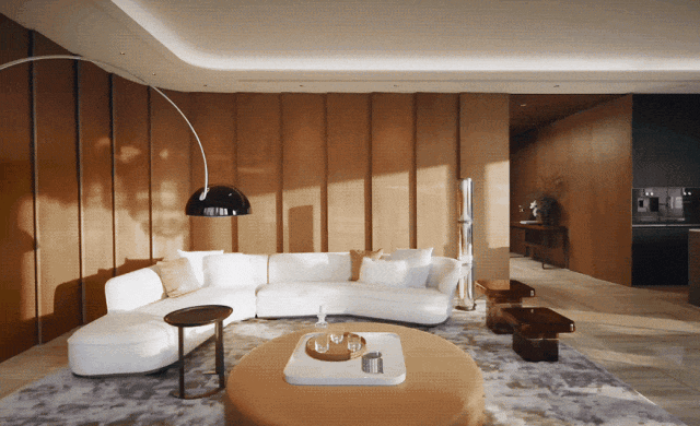 连浅咖色茶几都特意采用软包设计,弱化收纳,只为能随时放松地盘腿而坐,与亲友轻松畅聊。这正可参透Antonio的设计初心:愿人们忘却设计本身,每一天都真切地爱上这间宅邸所带来的雅致生活方式。