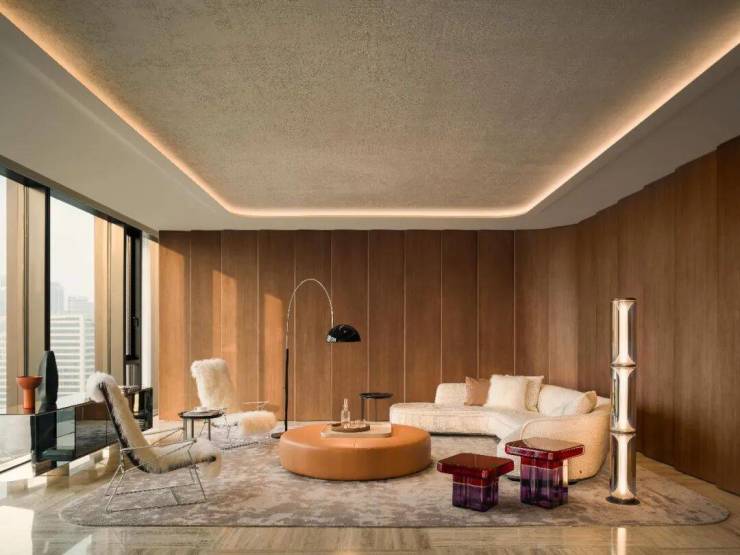 而有着同样优雅弧度的Maxalto Lilum米白色沙发,围合出慵懒安然的观景位,搭配一旁B&B Italia的J.J.单椅,金属的利落与羊毛的柔软温暖相拥,便有了或自在对谈、或看尽城市天际的悠然。
