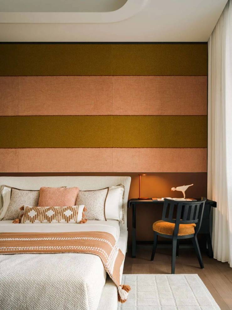 次卧则采用法国Elitis和西班牙Naturtex的面料装点背景墙,无论是焦糖暖调碰撞浅粉,还是仿亚麻肌理搭配浅暖棕,都自带个性主张。同时自带精巧阳台,推窗即可享受阳光景观,灵活适配不同居住需求。