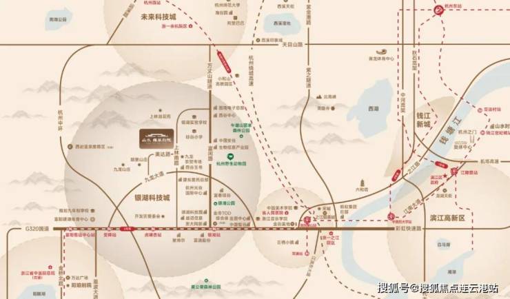 项目位于银湖科技城融杭门户,抢占交通资源高地,约1500米连接杭州地铁6号线虎啸杏站,瞬达杭州主城核芯。毗邻G320国道与彩虹快速路西延段,形成快速融杭交通走廊。