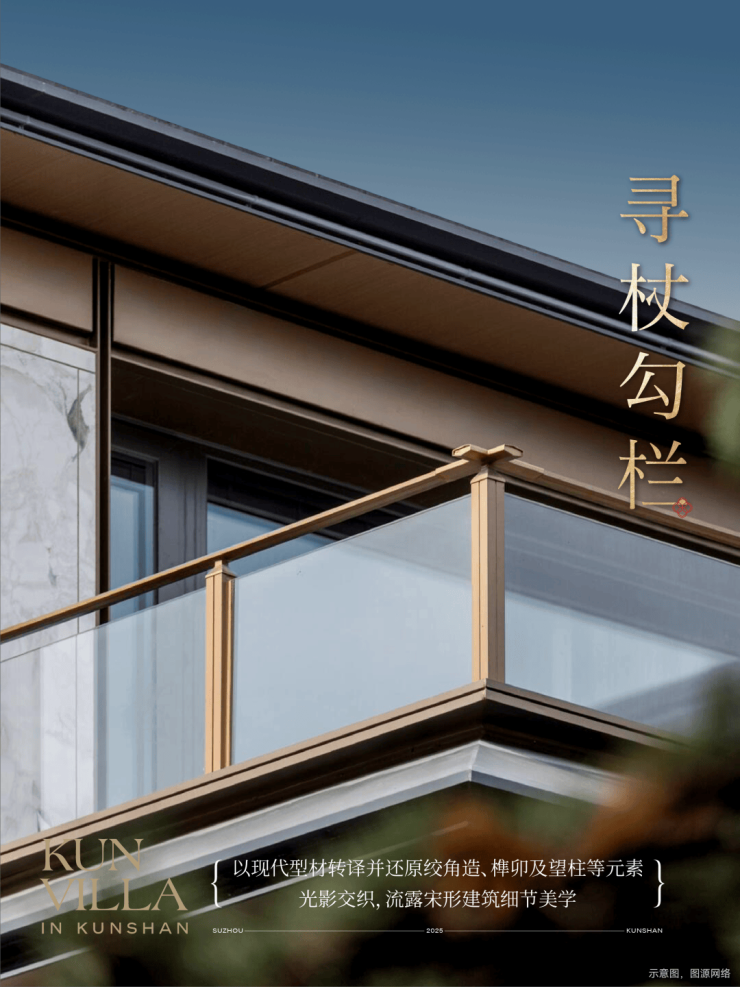 在细节上,绿城又开创性地首次重构了苏工技艺的精妙:比如结合宋式山水画屏与昆玉精雕的“白玉画屏”;比如以铝合金材料转译还原绞角造、榫卯及望柱等元素的“寻杖勾栏”;又比如绿城首次取形昆山市花琼花融合并蒂莲元素打造的“金镂格栅”,这些技艺不但代表着宋式美学“百事精微”的精神,更透露出绿城对产品细节的偏执。