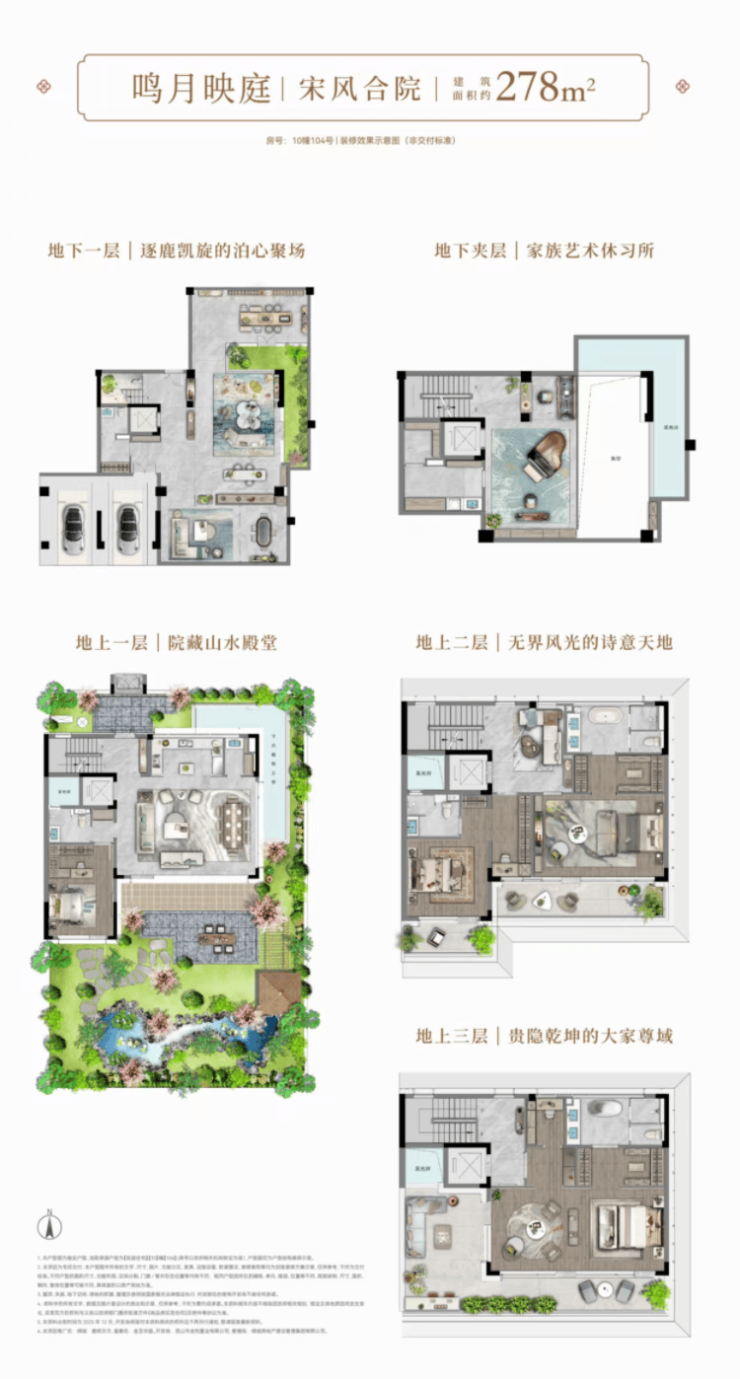 项目在合院产品中开创性引入“一宅六院”设计,构建出地下挑高光院、南向诗意庭院、北向入户礼院、二层观景静院、三层巨幕心院、三层露台星院。地下约5.7m挑高,一层层高约3.6m,二层层高约3.2m,三层层高最低3m,最高约4.55m。