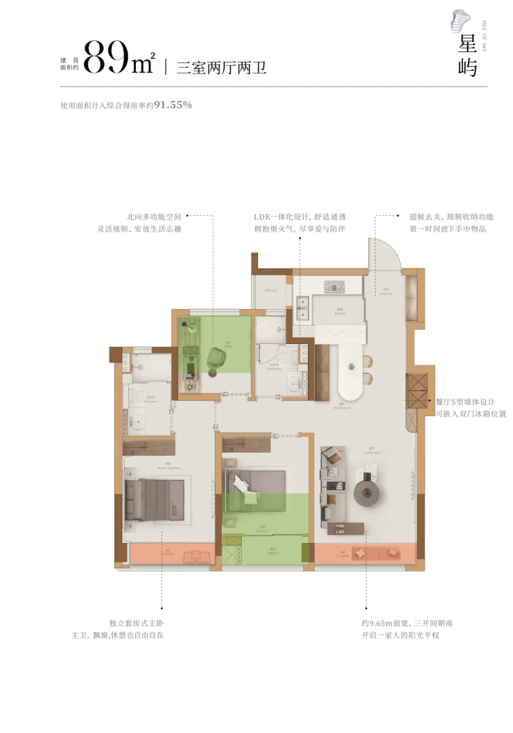 迭代升级户型:户型设计强调动静分区、通风采光与居住动线的合理性,注重空间利用率和实用性。例如,建面约89平方米户型做到三开间朝南,餐厅配有“S墙”可嵌入式双门冰箱;建面约103平方米户型拥有270°转角飘窗,空间利用率极高。