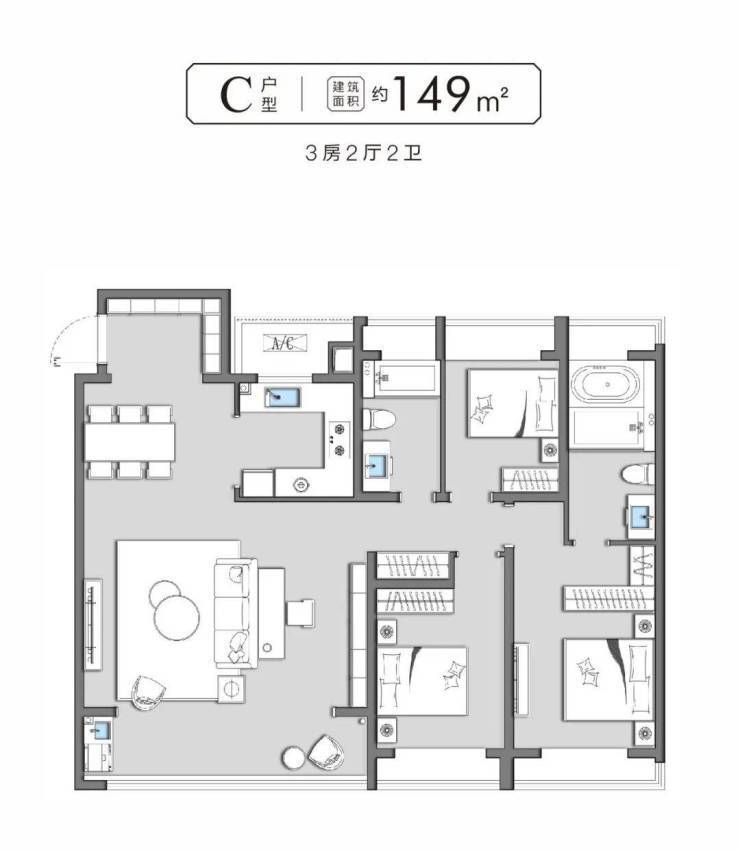 项目主力户型为105㎡三房、138㎡三房、149㎡三房和151㎡四房,层高3.1米,采用两梯四户设计,南北通透。目前均价约23000-25000元/㎡,物业由苏州华新国际物业公司负责,物业费2.47元/㎡/月,预计2024年12月底毛坯交付