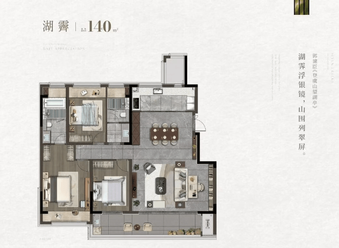 空间设计:主力户型均为140㎡三房两厅、170㎡四房两厅,得房率约78%,方正通透,南北对流,采光优越。