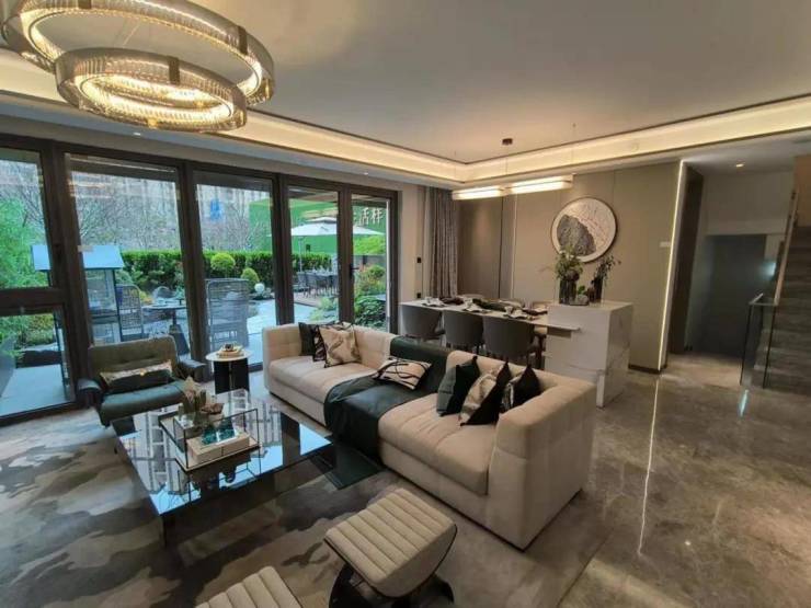 以268平下叠为例,主厅开间宽阔,客厅餐厅连通,大开间朝南,无论是视野还是采光都宽阔通透。