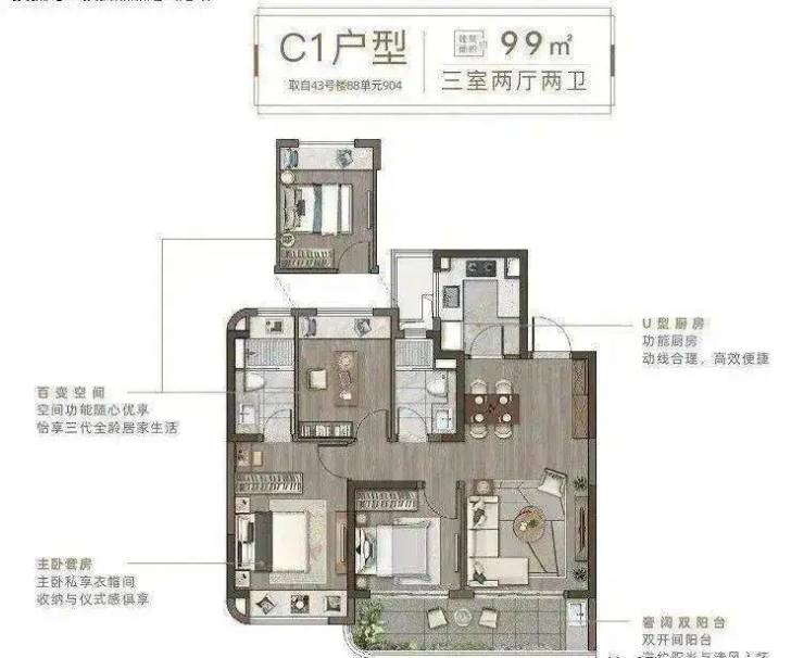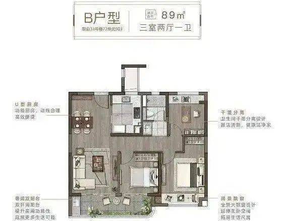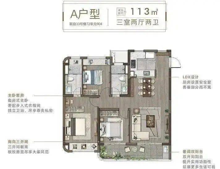 113㎡:三室两厅两卫,南向双阳台,主卧套房设计。(山河九里建面约89㎡户型图)