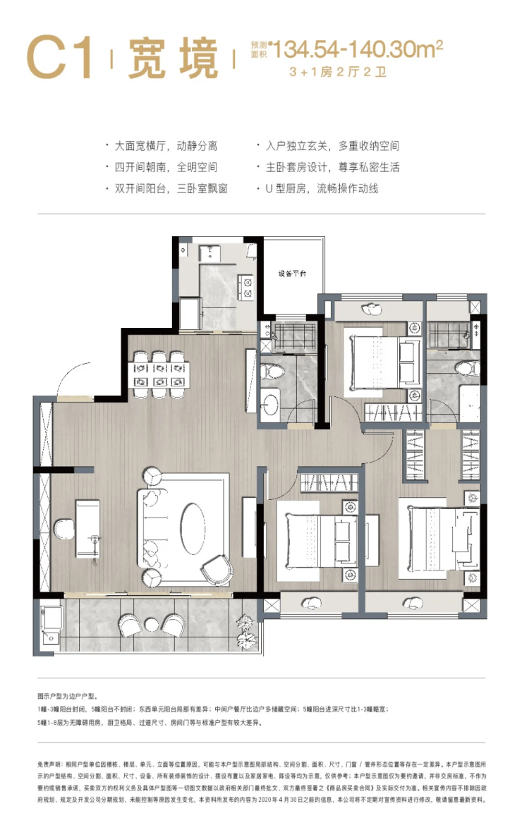 136-140㎡四房:终极改善,四开间朝南,超大面宽横厅,适合多代同堂家庭。