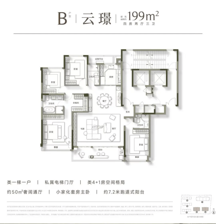 主力户型:建面约199㎡四房三卫双套房大平层,仅规划3幢20层高层,总户数稀缺