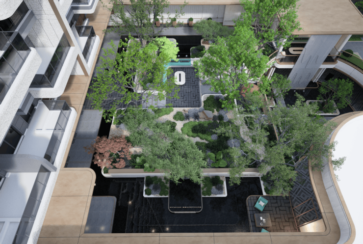 垂直森林立面:住宅立面秉承垂直森林花园理念,通过露台花园错层排布,使植物沿建筑向上自由延展,形成“空中绿洲”。