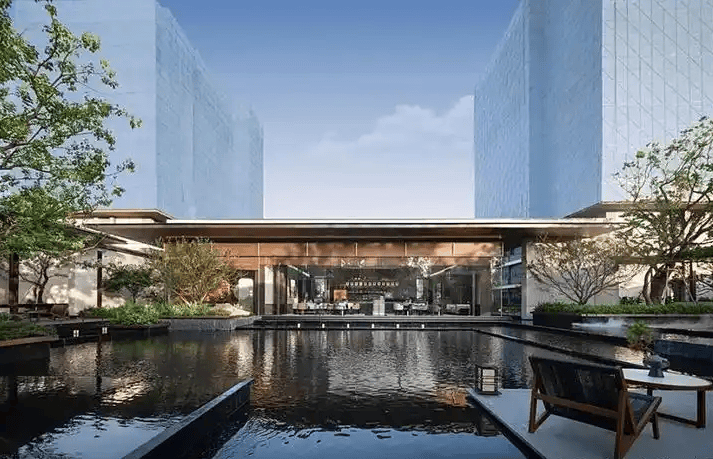 外立面采用昆石同色石材+现代铝材+高透玻璃,融合中式飞檐与现代极简美学,打造“塔冠设计”天际线