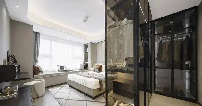 进入主卧,映入眼帘的衣帽间形成了一个微玄关,产生出一套隐私缓冲空间,衣帽间与主卫相连,化妆洗漱两不误,女主人亦能感受到友好。