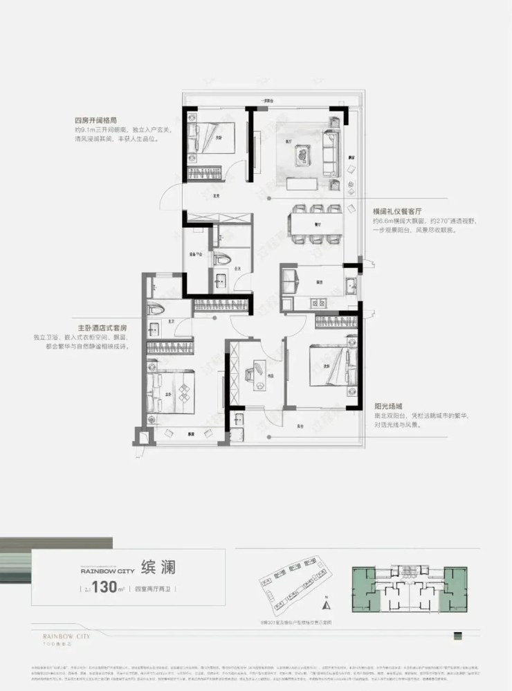 130㎡四房两厅两卫:实现270°环幕视野,南北双阳台设计,满足三代同堂或多孩家庭需求。