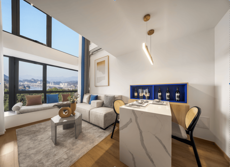 复式设计:4.5米挑高,一层为客厅/厨房,二层为卧室,空间灵活可办公或自住