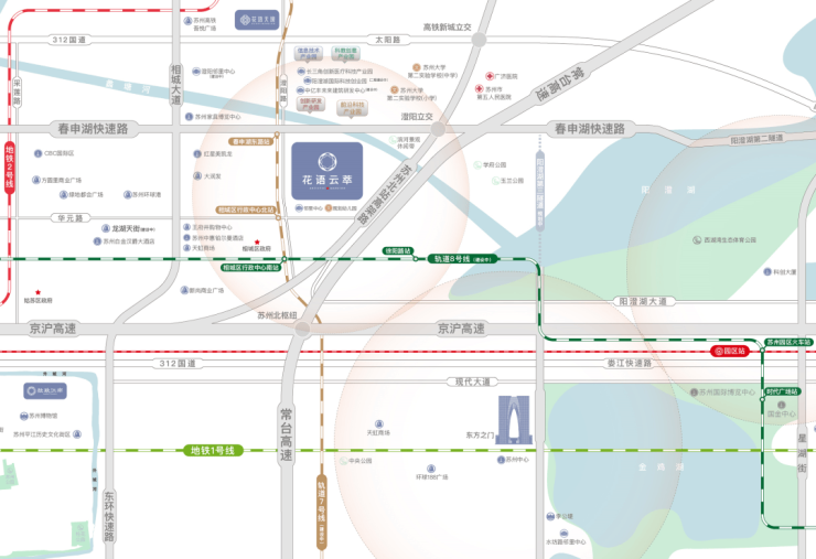 作为城市的主城核心一定需要一个及其完备的交通体系,相城区作为苏州的交通强区,项目周边涵盖了一高铁、二高速、双高架、双地铁、二横二纵路网的立体式交通网络,形成了相城核心生活圈、园区CBD生活圈。