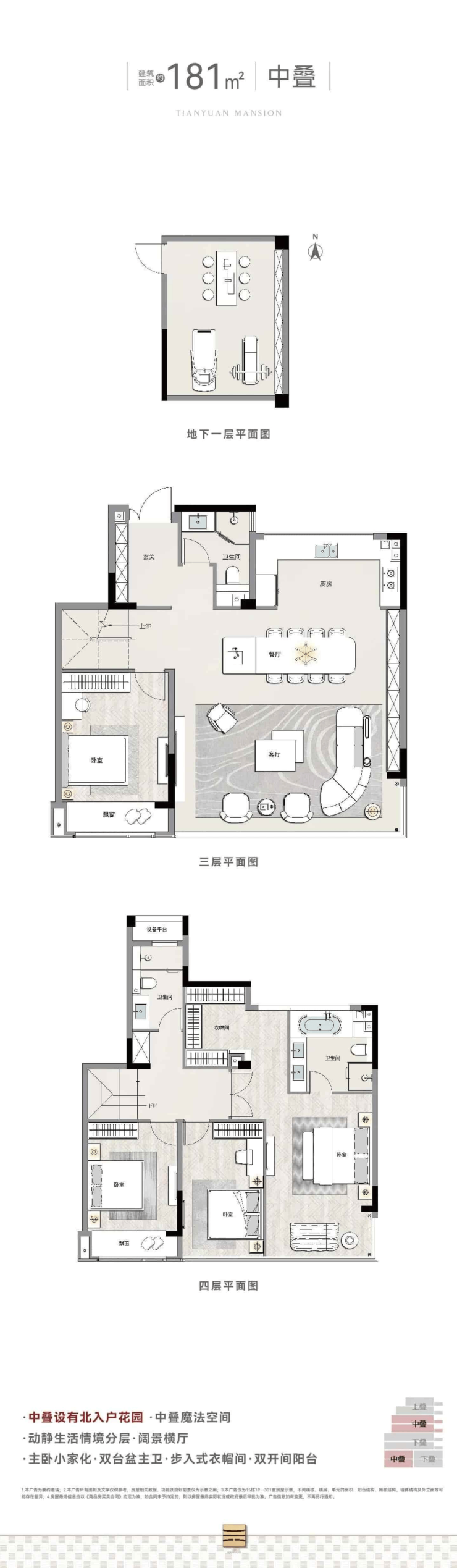 180㎡叠墅 — 490万–520万元 27,200–28,900元/㎡ 490万–520万元 上叠带50㎡露台,中叠带20㎡庭院