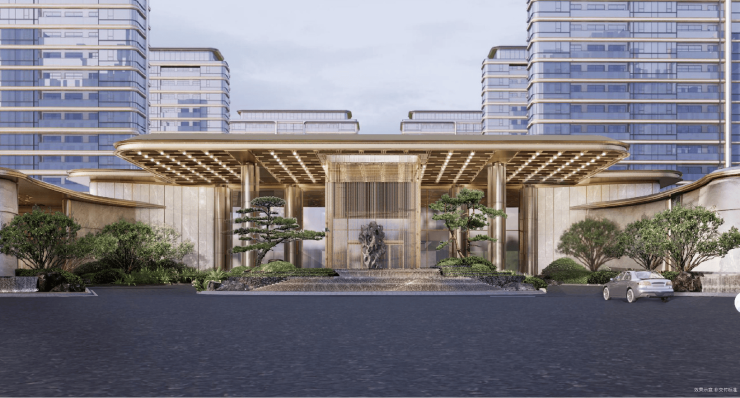 建筑外立面 银色铝板+玻璃幕墙+宋式官帽顶部设计,现代美学与东方隐逸融合,辨识度极高