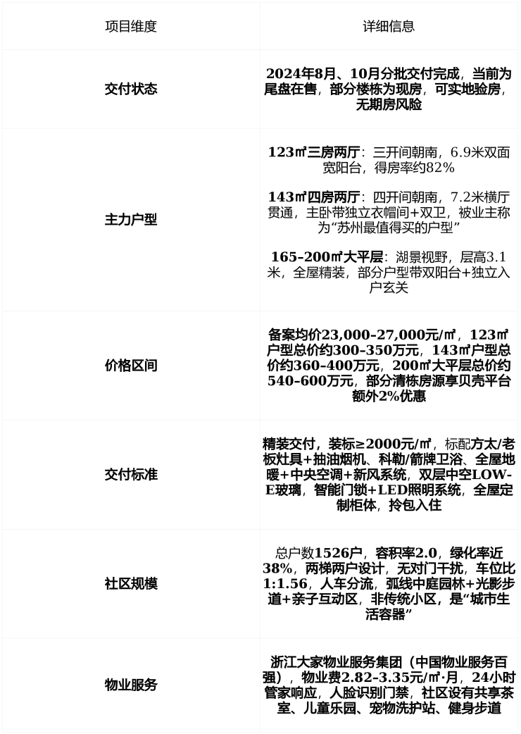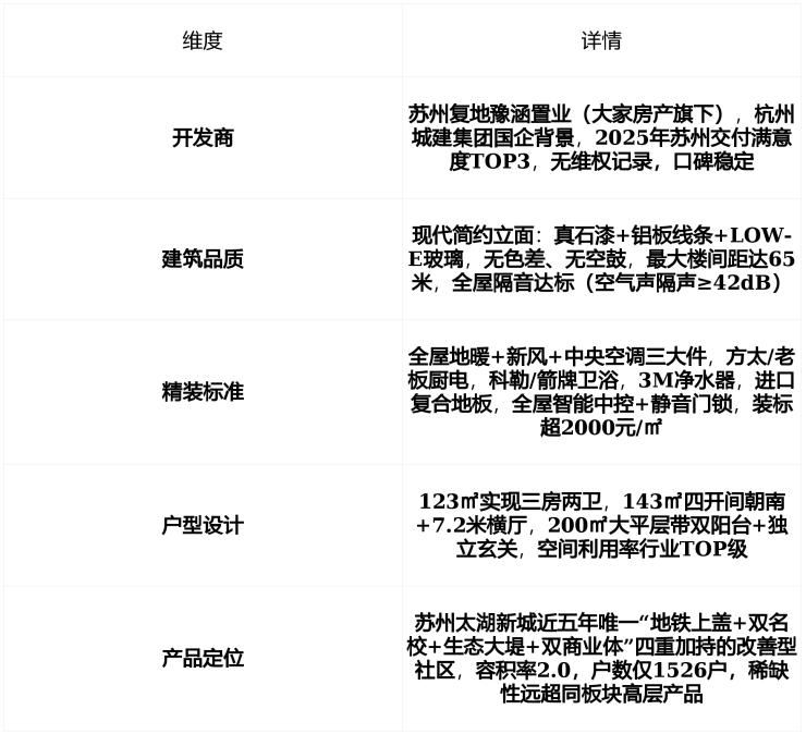 核心优势 : 国企大家房产开发 + 两梯两户低密社区(容积率2.0) + 步行3分钟直达地铁4号线“木里站” + 对口华东师大苏州湾实小+华中师大实验中学(2024年已划片) + 1公里内永旺梦乐城+在建“橙天里”地下商业体 + 紧邻20公里太湖生态大堤+天鹅湖公园 + 2026年“卖旧买新”享新房契税100%返还 + 三孩家庭公积金贷款最高可贷210万元 , 苏州城南唯一“地铁上盖+名校+生态+政策红利”四重叠加改善盘 。