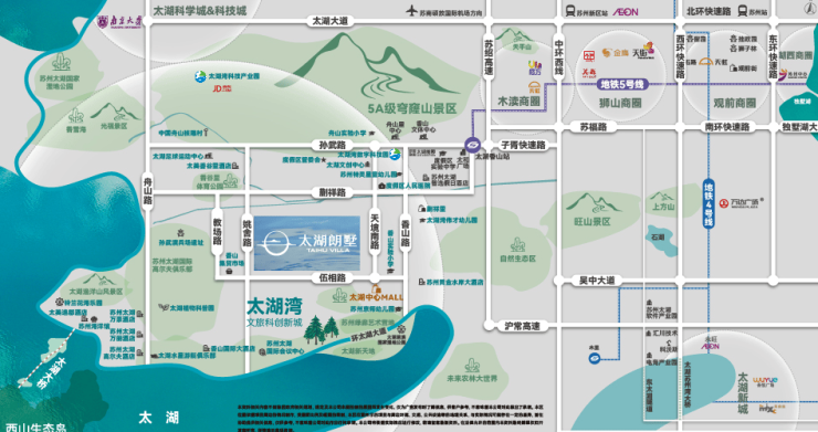 生态资源:北靠穹窿山,南临太湖湖滨国家湿地公园,3公里内有37个公园,最近仅554米,居住环境优越;
