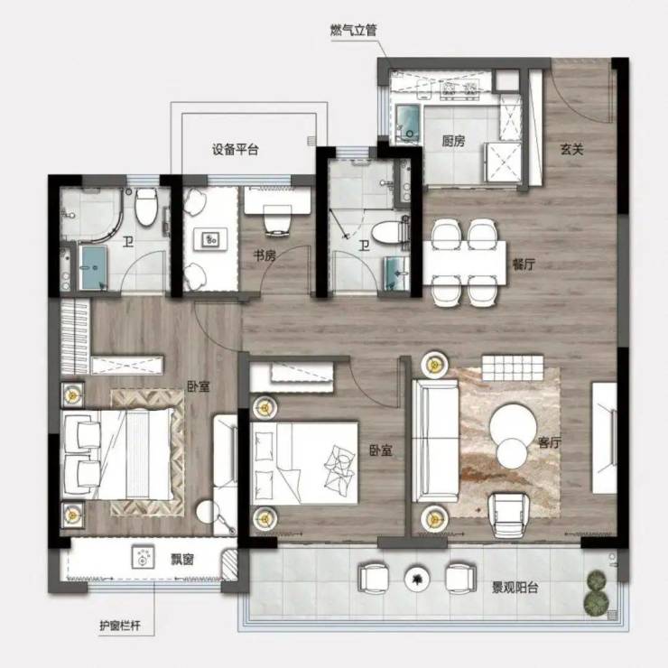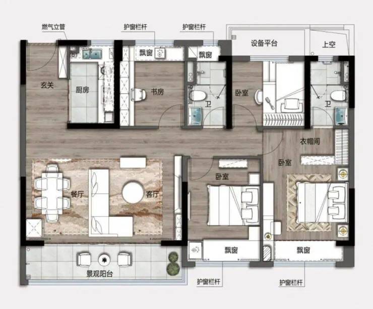 约120㎡四居4室2厅2卫6.2米宽景阳台,主卧套房带衣帽间及飘窗
