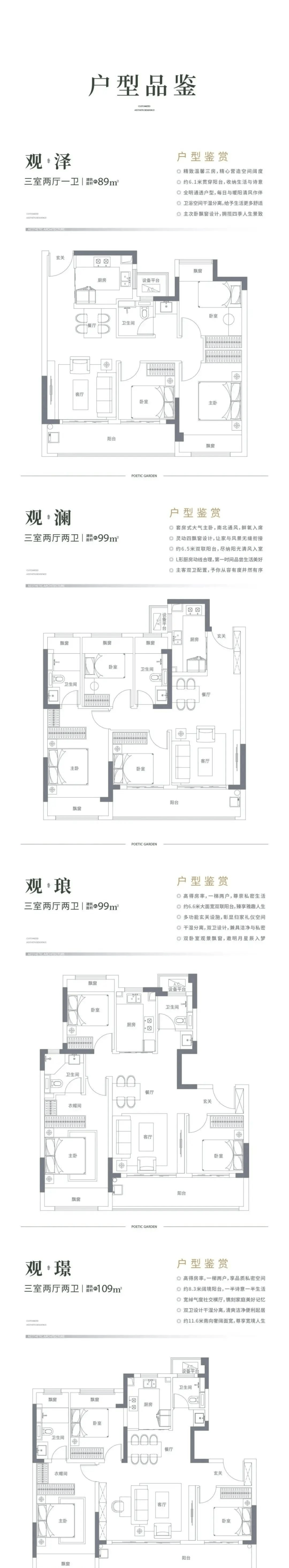### 3. 产品设计亮点#### 高定美学社区1. **外立面**:选用低饱和度的莫兰迪色系进行打造,同时搭配大面积的落地窗以及双联阳台。如此设计,能够在光线的作用下,形成独特的镜面光影效果,让整个建筑外观极具时尚感与艺术感。2. **园林设计**:构建了“一环两廊三轴八幕”的园林体系。其中,540米的环形跑道,为业主提供了舒适的慢跑空间;森林绿廊则营造出自然、静谧的氛围。八大功能场景更是丰富多样,像充满趣味的航海主题儿童乐园,为孩子们带来欢乐的童年时光;林下瑜伽区,让业主在自然的怀抱中享受身心的放松。3. **户型创新** - **89 - 109㎡三居室**:户型设计十分精巧,采用南向三面宽布局,让室内能够充分享受阳光的照耀。LDKB一体化设计,极大地提升了空间的连贯性与实用性。主卧套间配备独立衣帽间,满足业主的收纳需求。U型厨房搭配整体橱柜,操作更加便捷流畅。卫生间采用悬挂式马桶及镜柜系统,不仅美观而且实用。 - **得房率高**:洋房得房率约达80%,部分户型还赠送宽度为6.6米的双联阳台,为业主提供了更多可利用的空间,提升了居住的舒适度与性价比。