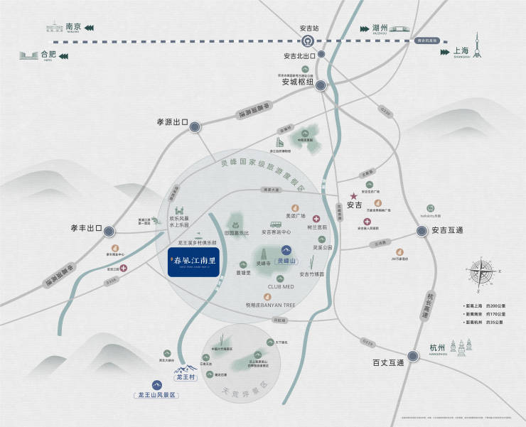 坐落于安吉4A级灵峰旅游度假区,三面环山,紧邻龙王山(浙北第一峰)、千亩竹海及杜鹃花海,负氧离子浓度达3万个/m³,全年空气质量100%优*。