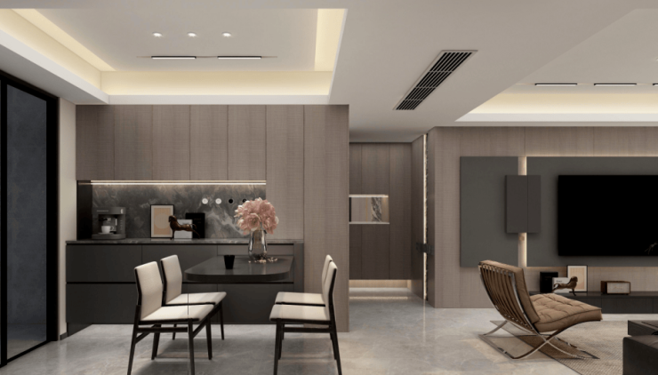 深色木质餐桌沉稳如磐石,奠定空间的质感基调