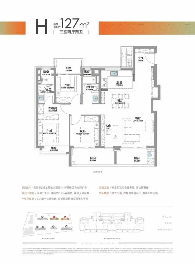 主力户型91–127㎡全三至四房改善型产品得房率约78%,层高3.05米(高于市场均值0.15米),三开间朝南,动静分离,零走道设计,空间利用率高