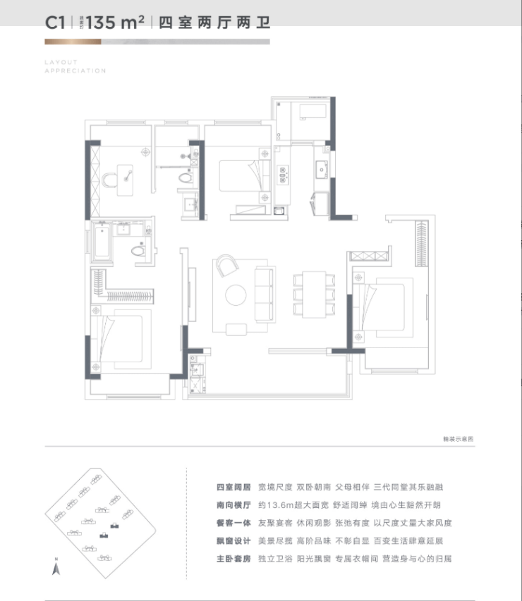 主力户型105-220㎡,全为三居及以上,满足三代同堂、多代共居真实需求。