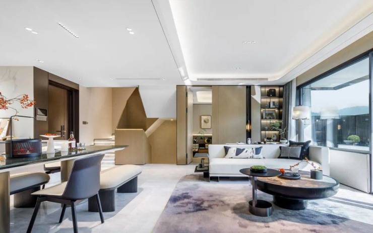下叠一层全景会客厅约6.7米开间的动区,畅享塔尖人物的尺度感和品质度,将世家风范展现地淋漓尽致。