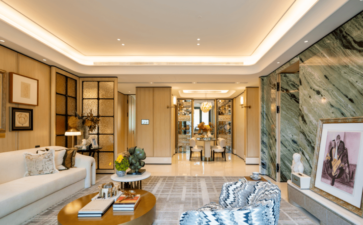 例如入户玄关铺设有“石材皇后”鱼肚印象,这种级别的奢石在很多顶豪项目中通常仅作局部镶嵌
