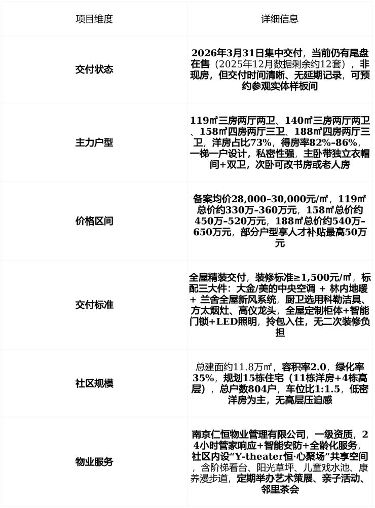 在售状态 : 2026年3月31日统一交付 , 当前仍有尾盘在售 , 主力户型为119–188㎡精装洋房与高层 , 备案均价28,000–30,000元/㎡ , 实际成交价区间稳定 , 非现房但交付日期明确,无延期风险 。