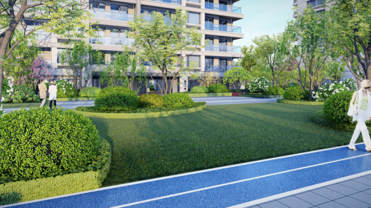 建筑之外,项目以“一环两轴多节点”的原则布局打造园区公区景观,用400m运动跑步道成环,而东西尊享归家轴和南北自然绿轴为两轴,同时规划爱享家、in花园、童梦国、颐养园、酷能站、缤纷谷、森林氧吧七大景观空间节点;