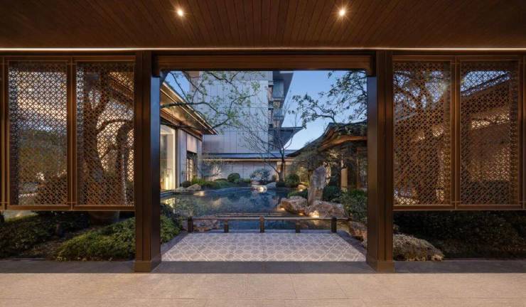 入园大堂正对二进水景中庭,曲折游廊与飞檐景亭合围了一方“四水归堂”的意境,这处借鉴「柳浪闻莺」的布局,经由高端宝格丽奢石点缀,铺陈一片自然青绿。