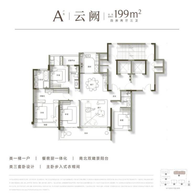 以首开建面约199㎡A户型为例,四房两厅三卫的格局,用超90%的得房率,让户型拥有洋房般的舒适尺度。