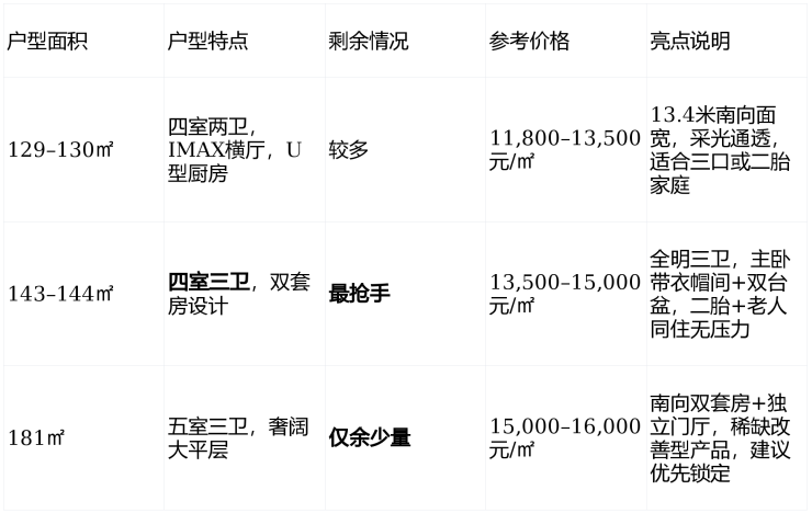 🔔 选房建议 :优先选择 143㎡三卫户型 ,南向采光单元,避开北向或夹层户型。