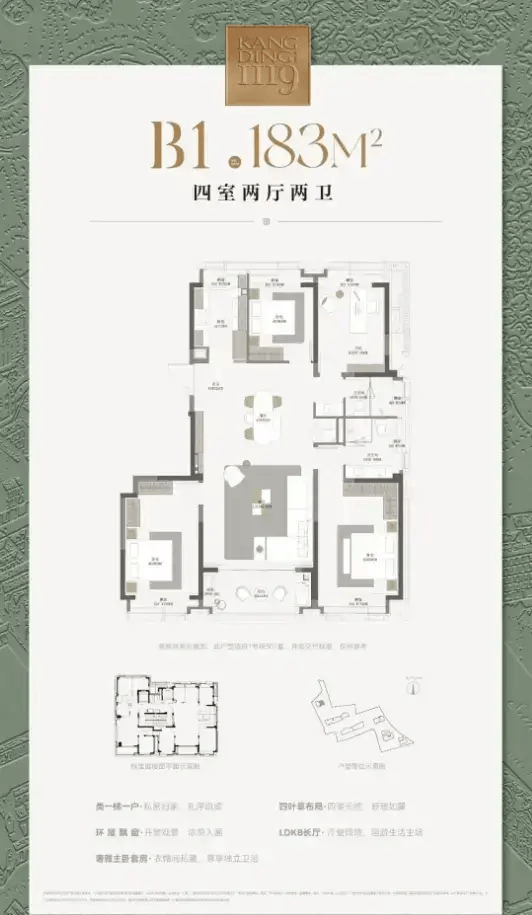 具体来看,康定壹拾玖提供了多种户型选择,主力户型涵盖建面约120-238㎡的三房至四房,满足不同家庭结构的需求。其中,120㎡的三房户型,总价大约在2000万元左右;而更为宽敞的238㎡四房大平层户型,总价则攀升至4000万元以上。这样的价格定位,无疑彰显了康定壹拾玖作为高端住宅项目的尊贵身份,是追求高品质生活的改善型购房者的理想之选。