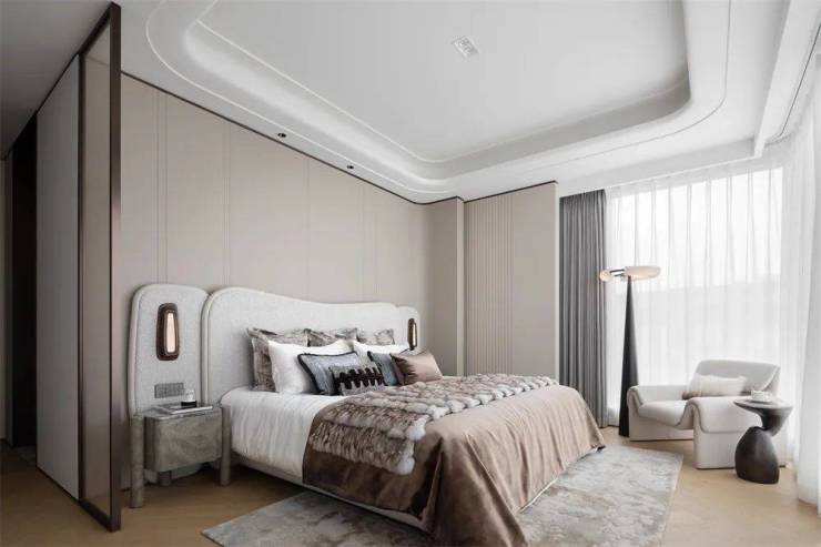 主卧更像是主人的一隅独立天地,内设独立的衣帽间和盥洗室,天花柔和的弧角温润亲和,背景墙的编织皮革似在雕刻时间的肌理,令空间产生熨帖身心的舒适感,在简练中探索人与空间的联系,传达人与物,人与空间,人与人之间的情感连接。
