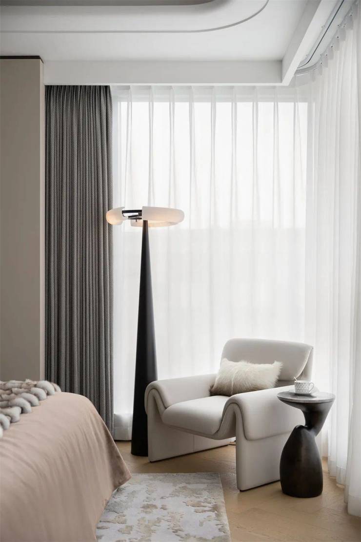 主卧来自Eda-Mame 的艺术躺椅,以弯曲和蜿蜒的线条为特征,宛如母亲的怀抱,温馨而舒适;个性创意的设计与高雅简约的色调自成意趣,彰显主人的艺术品味与生活情致。整体铺陈清雅而温润,纳入功能性与美学性相结合的设计理念,实用与美感平衡,疗养与情致并存,让长辈的生活更安稳舒心。