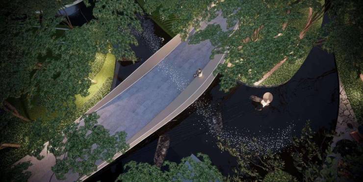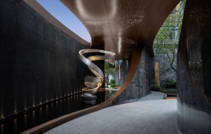 入园廊道天花板设计了星空顶,走道旁设有艺术装饰;往里走则是内庭水景区,让人仿佛踏进了喧闹城市中一方华丽又静谧的秘境,暖色灯光、林下休闲区,散发着慵懒的度假感。三进便是「艺术会所大堂」,请的是著名设计师吴滨。