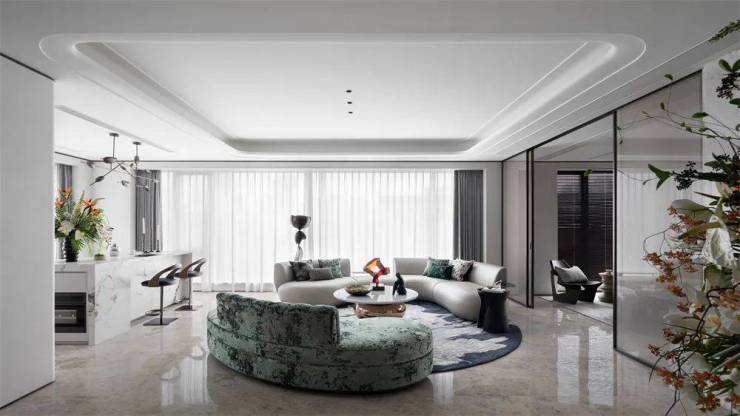 以空间收纳欢悦的时光,为生活赋予艺术的慰藉。约270°环幕社交三联厅,相连开合厅,通过空间的布局和光影的配合,场域与场域的贯通,营造为充满艺趣的社交场景,混合交叉又充满个性,开合之间,私密会客、开放式交流,家庭成员的个性需求,都一一得到照顾。