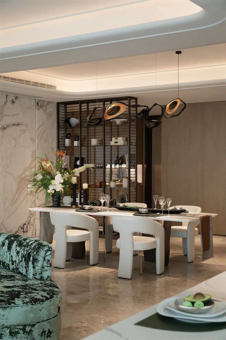 餐厅与客厅空间相贯连,开阔的视野带来惬意与更具互动感的用餐氛围。法国餐具品牌Christofle的精巧工艺与大理石水墨画般的自然纹理交相叠映,镜面光泽,熠熠生辉,每一处细节都彰显着对品质生活的极致追求。