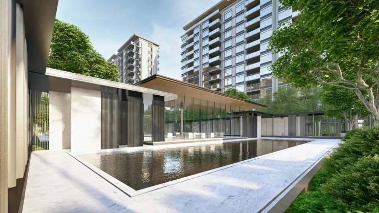 森兰海天名筑采用现代高端风格,外立面以米白色石材搭配深灰色金属线条,局部采用大面积玻璃幕墙,既彰显高端质感,又能最大化引入海天景观与阳光
