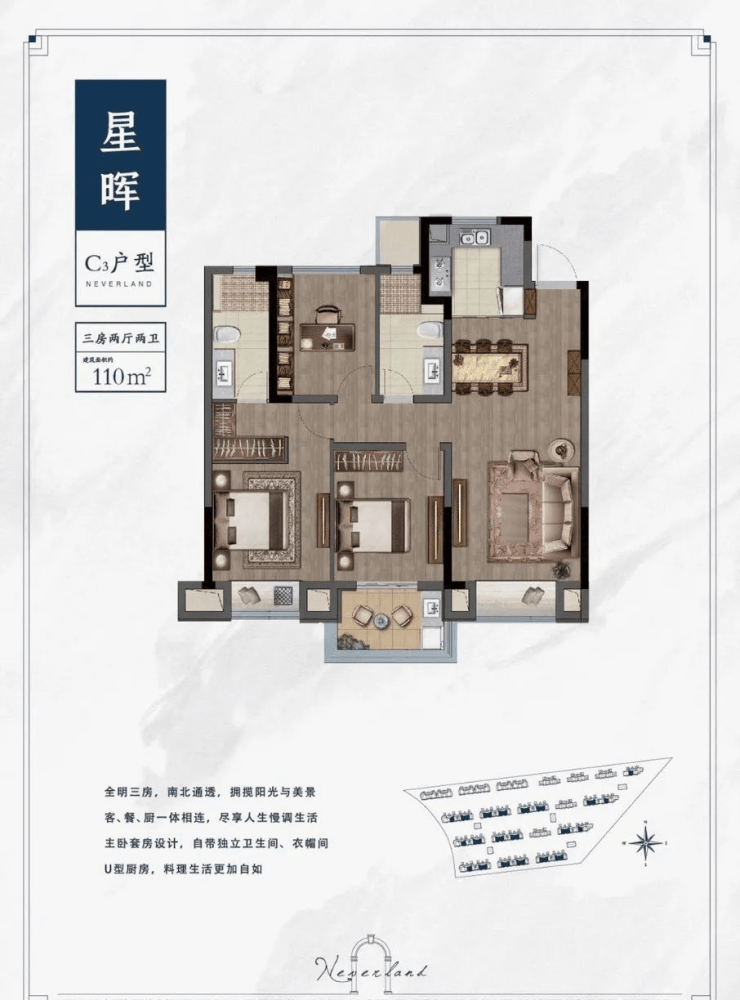 110㎡的三房两厅,相比上两个户型来的更为方正,三开间朝南,套房主卧带衣帽架,次卧难得拥有大阳台,采光效果可谓一流!