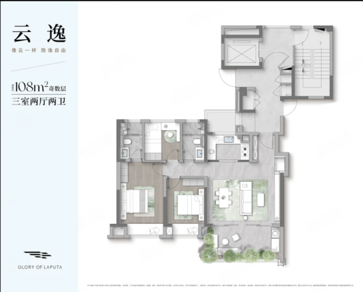 108㎡ 云逸 | 三室两厅两卫:奇数层/偶数层得房率均约95%,适合刚改家庭
