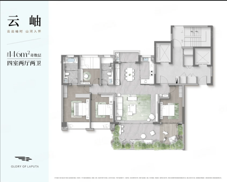 146㎡ 云岫 | 四室两厅两卫:奇数层得房率约106%,偶数层高达123%,部分户型可实现四房