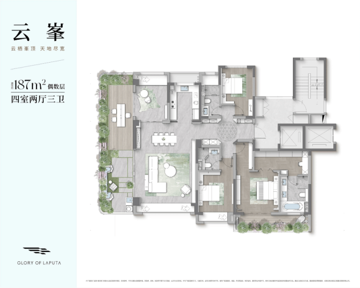 187㎡ 云峯 | 四室两厅三卫:奇数层得房率约123%,偶数层约111%,顶层户型得房率最高达130%